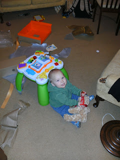 Yesterday we celebrated Caleb's first birthday. It's so hard to believe that a year has gone by so fast. I think I posted these pictures in the order that they were taken. So, we started our little guy's day with some birthday milk (he's a bottle boy now). He then showed off his walking skills (with Daddy's help) and danced to one of our favorite songs with Dan. We then had birthday muffins and presents. He enjoyed his first muffin and had fun with the presents (especially the wrapping paper :) Dan was so excited too! We had a great day and many visitors throughout. We love our Caleb. Happy Birthday sweet boy!